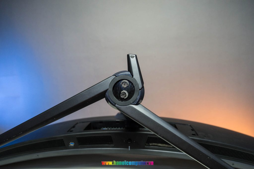 Vì đây là màn hình cong, kích thước lớn lại rất dài nên phần chân đế không thể linh hoạt được giống như những màn hình có kích thước nhỏ. Cụ thể màn hình này có chiều cao nâng lên hạ xuống khá thấp, góc ngửa ra, ngửa vào màn hình cũng rất nhỏ. Và đặc biệt là không dựng dọc màn hình lên được.