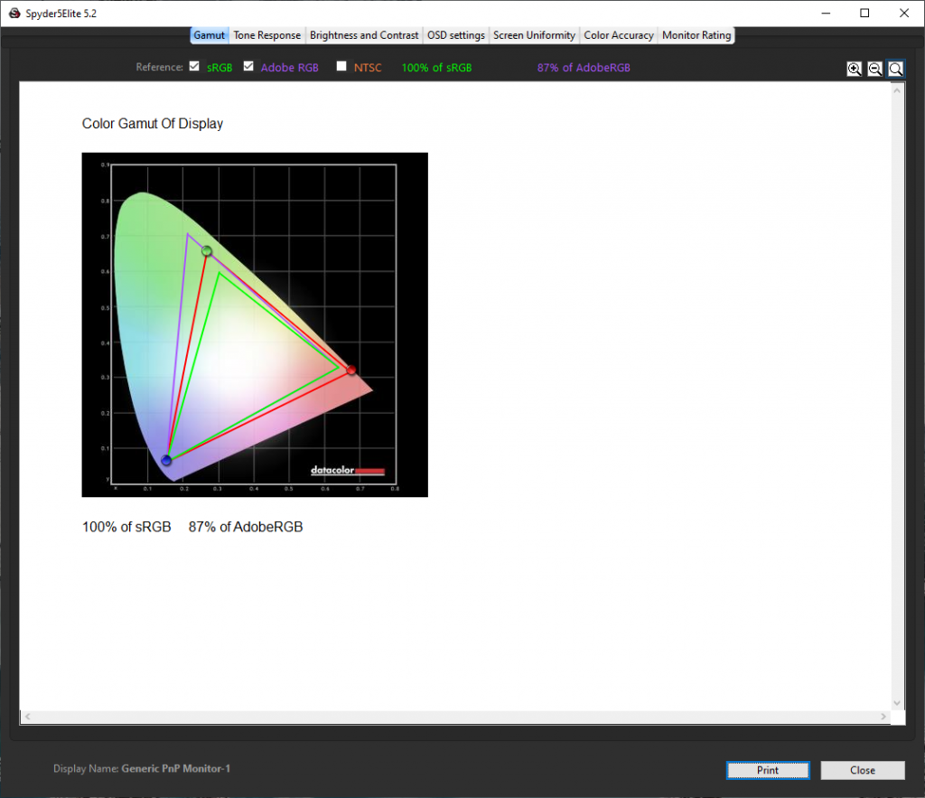 Kết quả ở bài test này là 100% sRGB và 87% Adobe RGB, con số 87% không gian màu AdobeRGB có thể so sánh với DCI-P3. Nên con số 125% sRGB do hãng đưa ra tương đối chính xác