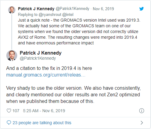 ServerTheHome Patrick J Kennedy đã phát hiện ra phiên bản GROMACS sử dụng bởi Intel là bản lỗi thời và không tối ưu cho tập lệnh 256-bit wide AVX2 SIMD trên dòng Zen 2. Bản GROMACS 2019.3 được sử dụng bởi Intel cho bài thử nghiệm “thực tế” của mình, nhưng, phiên bản mới nhất là 2019.4 được thêm phần hỗ trợ cho tập lệnh Zen 2 của chip EPYC Rome như EPYC 7742 mà Intel thử nghiệm so sánh với Xeon Platinum 9282 của họ. Kết quả khá lệch lạc kể cả bài thử “thực tế” của Intel không chỉ ra được hiệu năng thực tế và có thể dẫn đến nhầm lẫn cho các sản phẩm của đối thủ. Và đây không phải lần đầu tiên Intel sử dụng các bài benchmark sai dể dìm đối thủ. Họ thậm chí bác bỏ một số chỉ số hiệu năng quan trọng sử dụng với các reviewer công nghệ nói rằng chúng không có nghĩa và không chỉ ra được hiệu năng thực tế của sản phẩm như kết quả mà họ tự kiểm chứng.