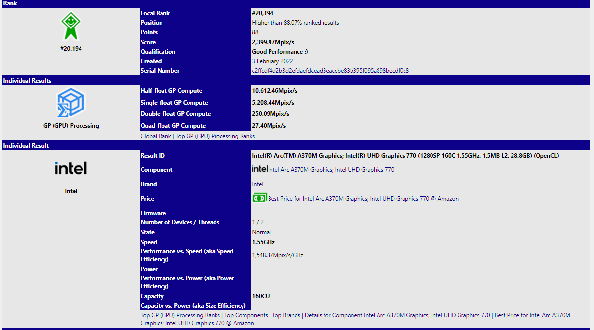Theo như Sisoftware, Intel Arc A370M có 160 đơn vị thực thi (EU). Tuy nhiên đối chiếu với các tin đồn trước đó, con số này là sai và thực chất sẽ chỉ có 128 EU, giống như mẫu A380. Phần 32 đơn vị còn lại là do trang Benchmark đã cộng gộp cả iGPU UHD 770 của CPU Intel Alder Lake. Thêm vào đó, mức xung nhịp của chiếc Card mang nhân Xe-HPG được liệt kê trên trang web là 1.5Ghz.