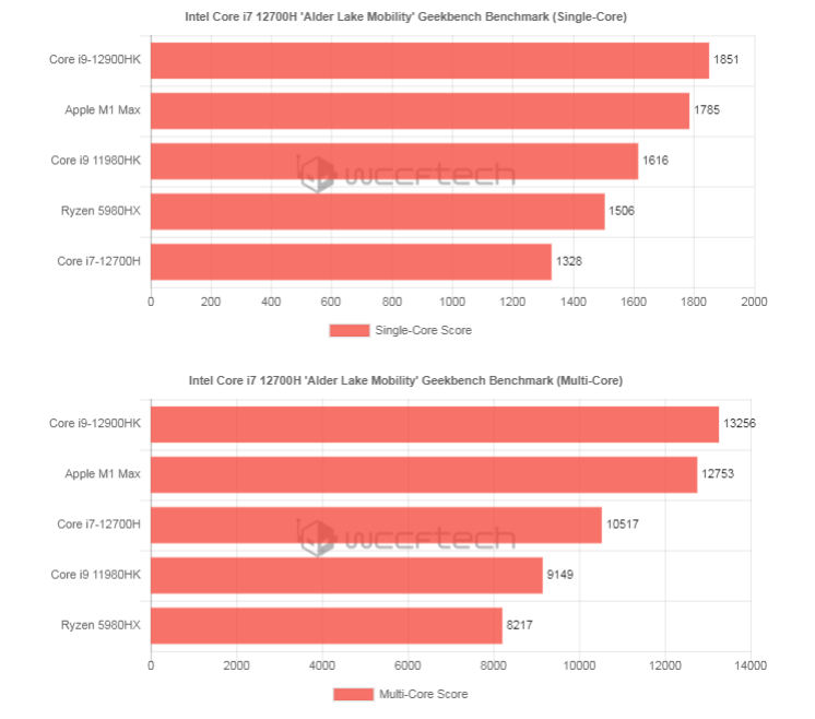 thang điểm benchmark đơn và đa nhân của CPU core i7-12700H, ảnh: wccftech
