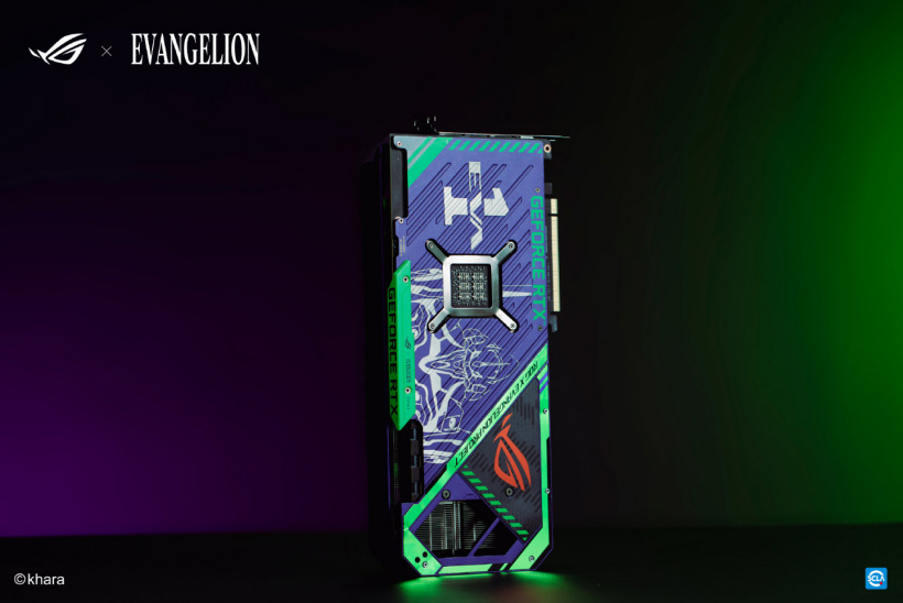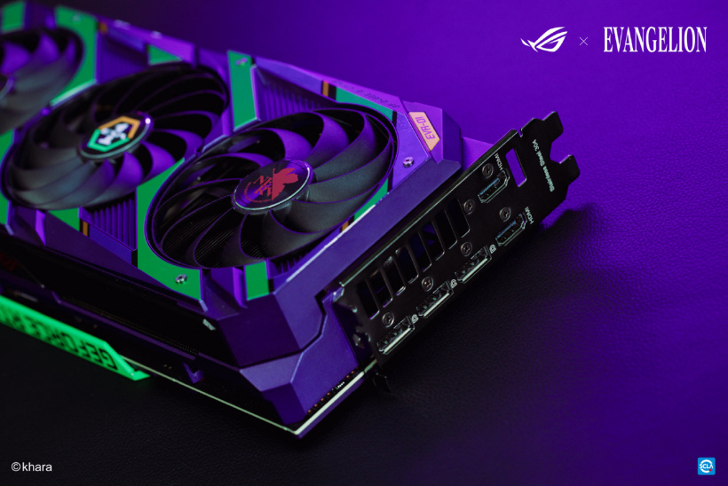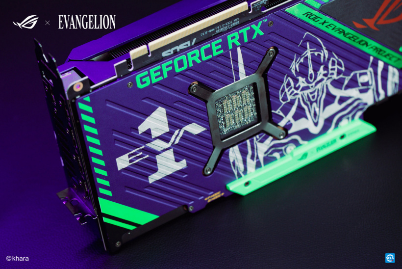 ROG cho biết, chiếc card đồ họa này sử dụng thiết kế tổng thể màu xanh tím của cỗ máy EVA đầu tiên, chiếc quạt có thêm mẫu đầu tiên và họa tiết Logo NERV. Mặt sau in hình phác thảo đường nét của chiếc máy thứ nhất. Ba chiếc quạt được sử dụng công nghệ hướng trục “Axial”, bố trí quạt làm mát tối ưu hơn cho các bộ tản nhiệt kích thước lớn. Quạt lớn với công nghệ hướng trục với phần lõi nhỏ hơn tạo điều kiện cho các cánh quạt dài hơn và một vòng nhựa chắn để tăng áp suất không khí đi xuống..