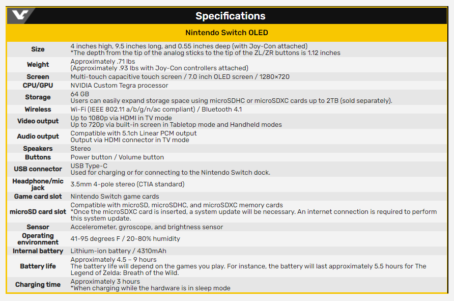 Nintendo chưa xác nhận chip (SoC) cho thiết bị mới này, mặc dù NVIDIA Custom SoC được liệt kê trong thông số kỹ thuật chính thức. Trái với những tin đồn trước đó, Switch OLED không hỗ trợ chế độ TV 4K với NVIDIA DLSS. Trên thực tế, có thể NVIDIA SoC không hỗ trợ DLSS. Có vẻ như mẫu OLED mới có thể dựa trên cùng một SoC như mẫu Switch không phải OLED hiện tại.